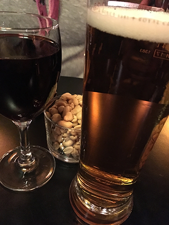 Ett glas rött och en öl och nötter så vi blev lite varma.