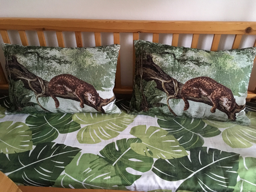 Två leopardkuddar, perfekta till soffan i Djunglrummet, tycker jag.
