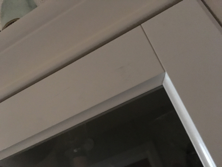 Vi gnussade bort tejp från Annas vitrinskåp.