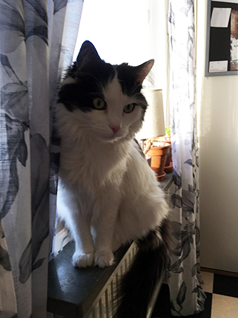 Lucifer i köksfönstret – men inte spanar han på fåglar, han spanar på mina mackor.