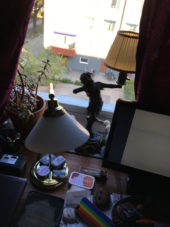 Isärdragna gardiner och utsikt från hemskrivbordet.