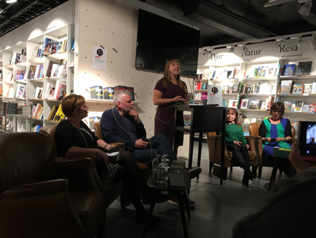 Fyra för fattare och en kritiker från Svenska Deckarakademin. Damen längst till vänster är visst också kritiker, men jag missade hennes namn liksom namnet på hon som står upp på bilden.