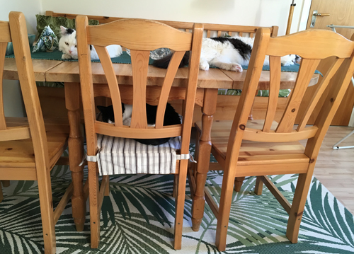 Familjen Katt på Annas köksbord och en köksstol