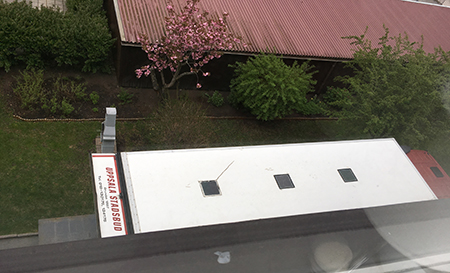 Stadsbudsbil utanför köksfönstret