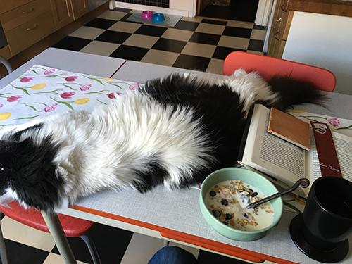 Frukostbord med katt.