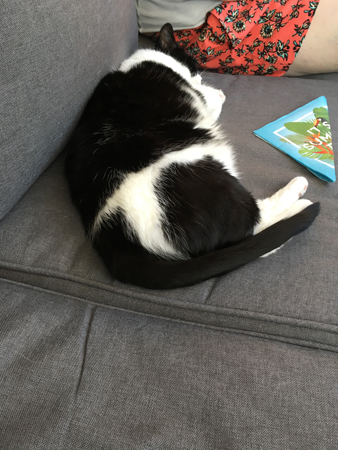 Mini låg mellan oss i balkongsoffan medan vi åt.