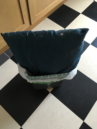 Pappas sidenkudde gick i sopen och jag har slängt påsen.