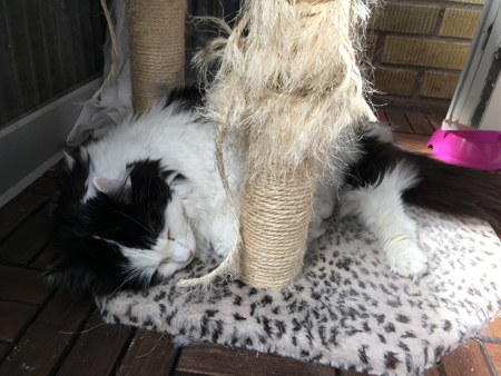Lucifer sussar gärna under klätterställningen på balkongen.
