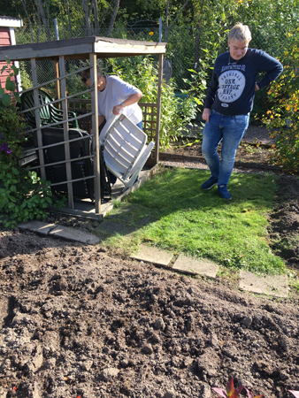 Mormor och gymnasisten har burit stolar. Mormor arrangerar om.