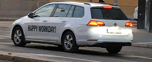 Bil med texten Happy workday