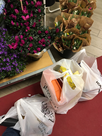De tre matkassarna kompletterades med vinkassar och en blomsterkvast.