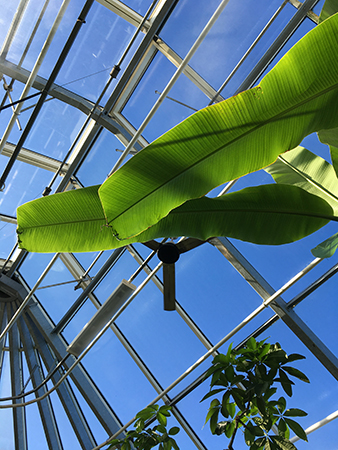 Men inne i Tropiska växthuset var det grönt mot den blå himlen utanför.