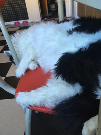 Lucifer låg på en köksstol vid frukosten, för ovanlighetens skull.