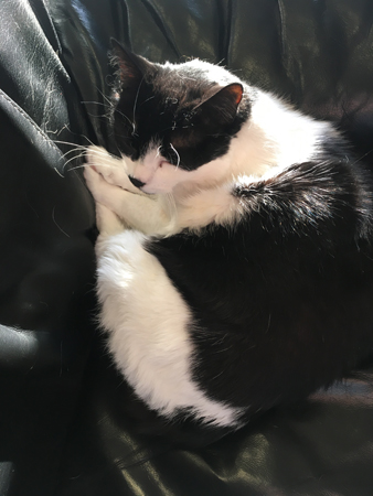 Mini låg som en svartvit falukorv i Annas fåtölj.