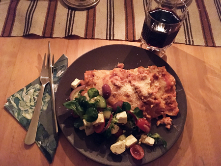 Lasagne på kycklingfärs grönsaker och ett glas Il Seggio