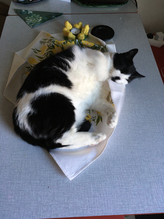 Mini på köksbordet rullat in sig i duk