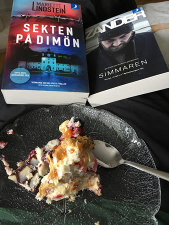 Böckerna Sekten på Dimön och Simmaren, som låg i det blå paketet, samt min tårtbit i mitten…