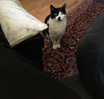 Mini vill ha rätt kattsand. Här är hon emellertid på väg att hoppa upp på armstödet på min fåtölj.