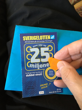 Sverigelott min hand och orange skrapa
