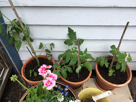 Tre sorters tomater längst in mot husväggen.