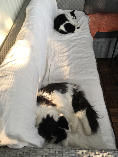 Mini och Lucifer är rätt bra på soffhäng. Här soffhänger de på balkongen.