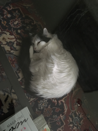 Busan Citrus på sin favoritplats intill soffan i vardagsrummet.
