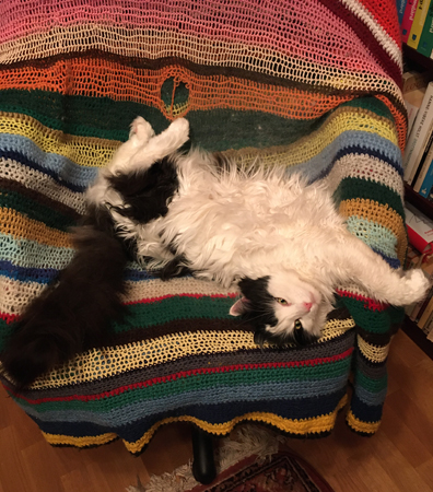 Jag räknar med att jobba hemma i helgen, men inte vid datorn. Skrivbordsstolen är som synes upptagen av herr Lucifer Katt.