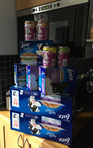 Ja våra katter lär inte svälta med det här matberget i skafferiet…