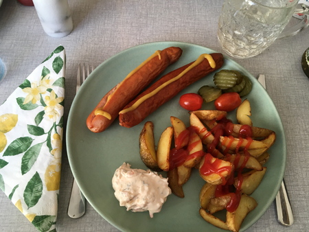 Kycklingkorv potatisklyftor räksallad gurka tomater vatten