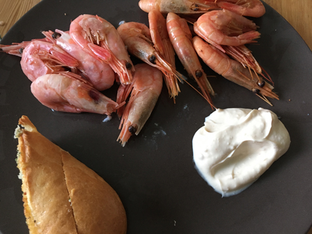Vanliga räkor och rökta med vitlöksbröd och chiliaioli.