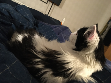 Lucifer på besök i sovrummet. Han har en egen filt här.