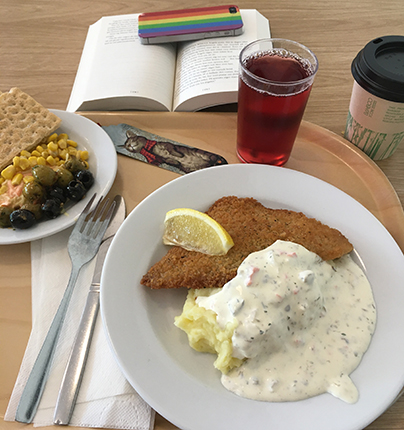 Panerad fisk med mos sås grönsaker lingondricka kaffe