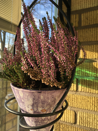Ljungträd i lila ampeln på balkongen
