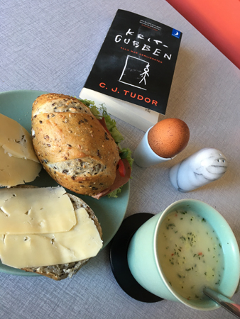 Lunch med mackor, varma koppen och boken Kritgubben.
