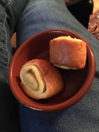 Två saffransgifflar på mitt feta jeanslår.