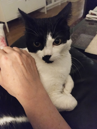 Mini med uppspärrade ögon och öronen bakåt och min hand