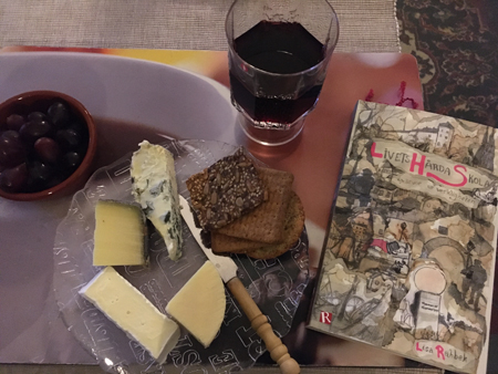 Kex, ostar och druvor att tugga på, ett glas rött att värma sig med samt en viktig bok jag började läsa igår kväll.