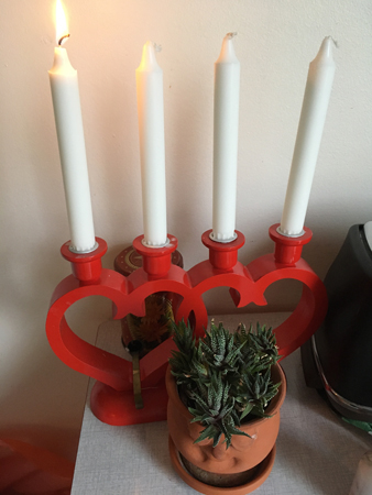 Första adventsljuset tänt i Annas röda adventsljusstake.