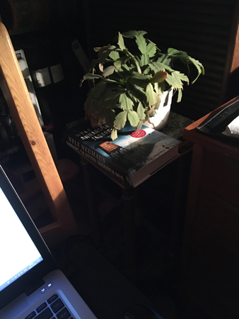 Min bok på gång har jag alltid med mig. Under arbetsdagen ligger och trängs med en kaktus på piedestalen i Bokrummet.
