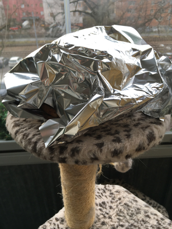 Kalkonen på kylning på katternas klätterpelare på balkongen.