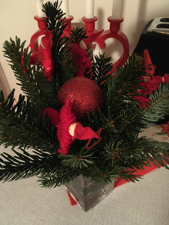 Det bortfriserade fick plats i en vas tillsammans med några tomtar och en kula.