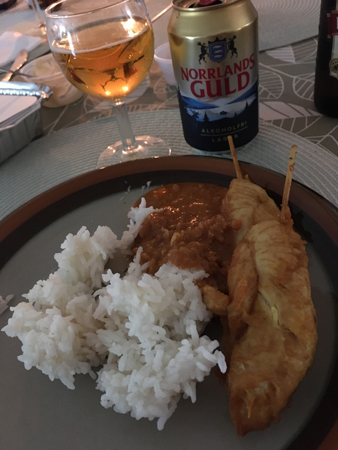 Alkoholfri öl till kycklingspetten med jordnötssås och ris.