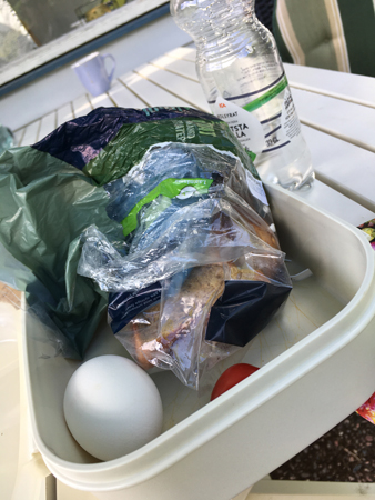 Lunchlåda med smörgås kokt ägg och tomat vatten