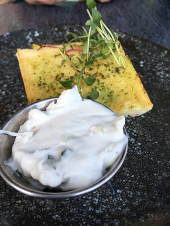 Vitlöksbröd och tzatziki till förrätt på Sjöglimten.