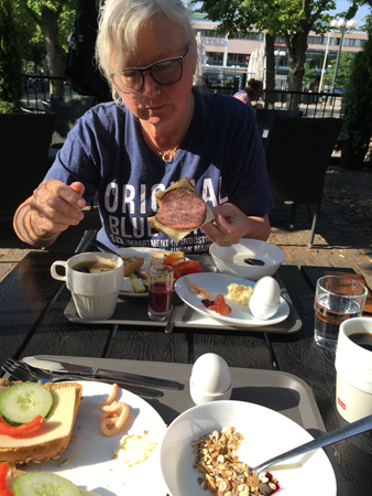 Anna äter hotellfrukost och jag fotade just när hon tuggade.