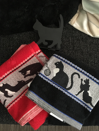 Jag shoppade ett servettställ och två handdukar med kattmotiv.