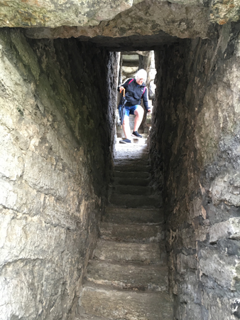 Anna klättrar i en smal trappa i St Clemens kyrkoruin