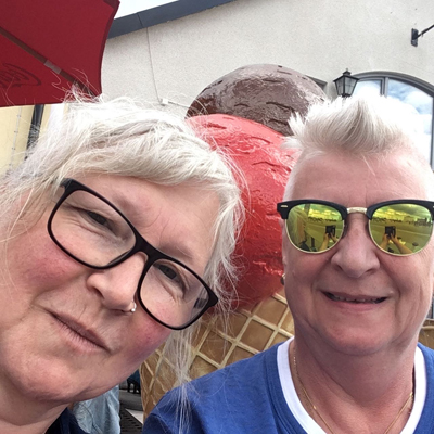 Anna och jag med en gigantisk röd glasskula mellan oss.