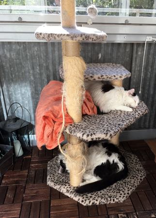 Citrus och Lucifer sover på klätterpelaren på balkongen