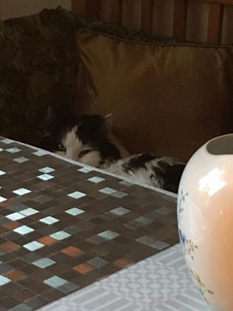 Katten Lucifer kniper med ögat i Annas kökssoffa